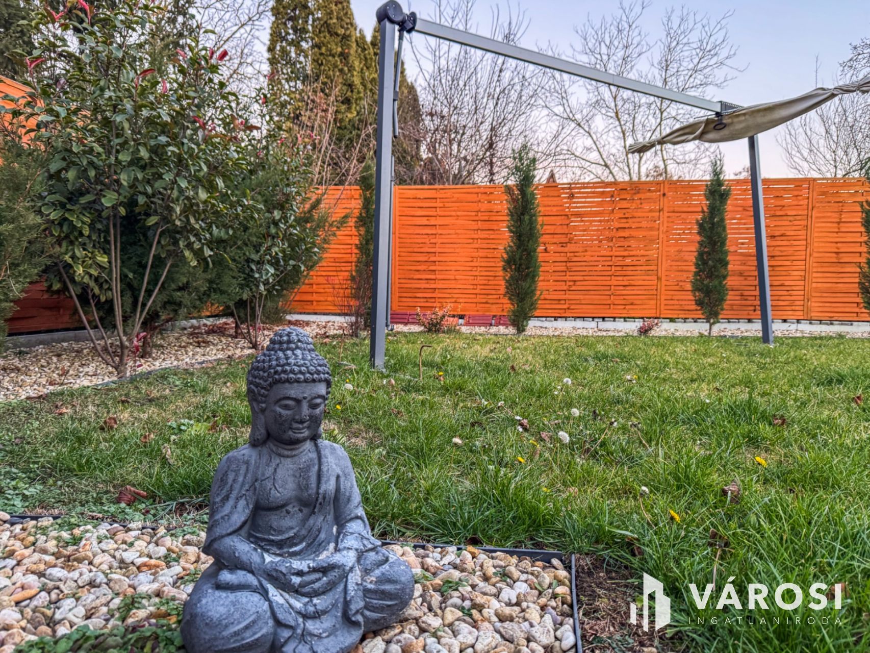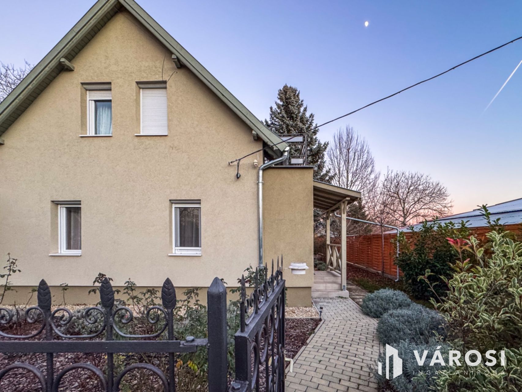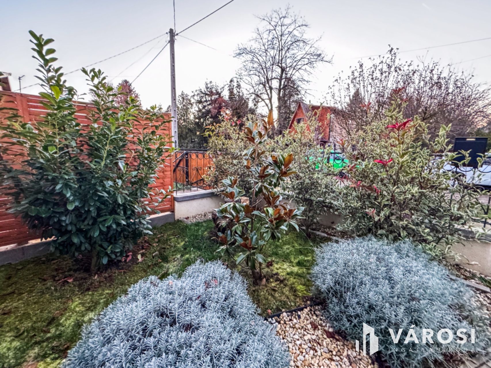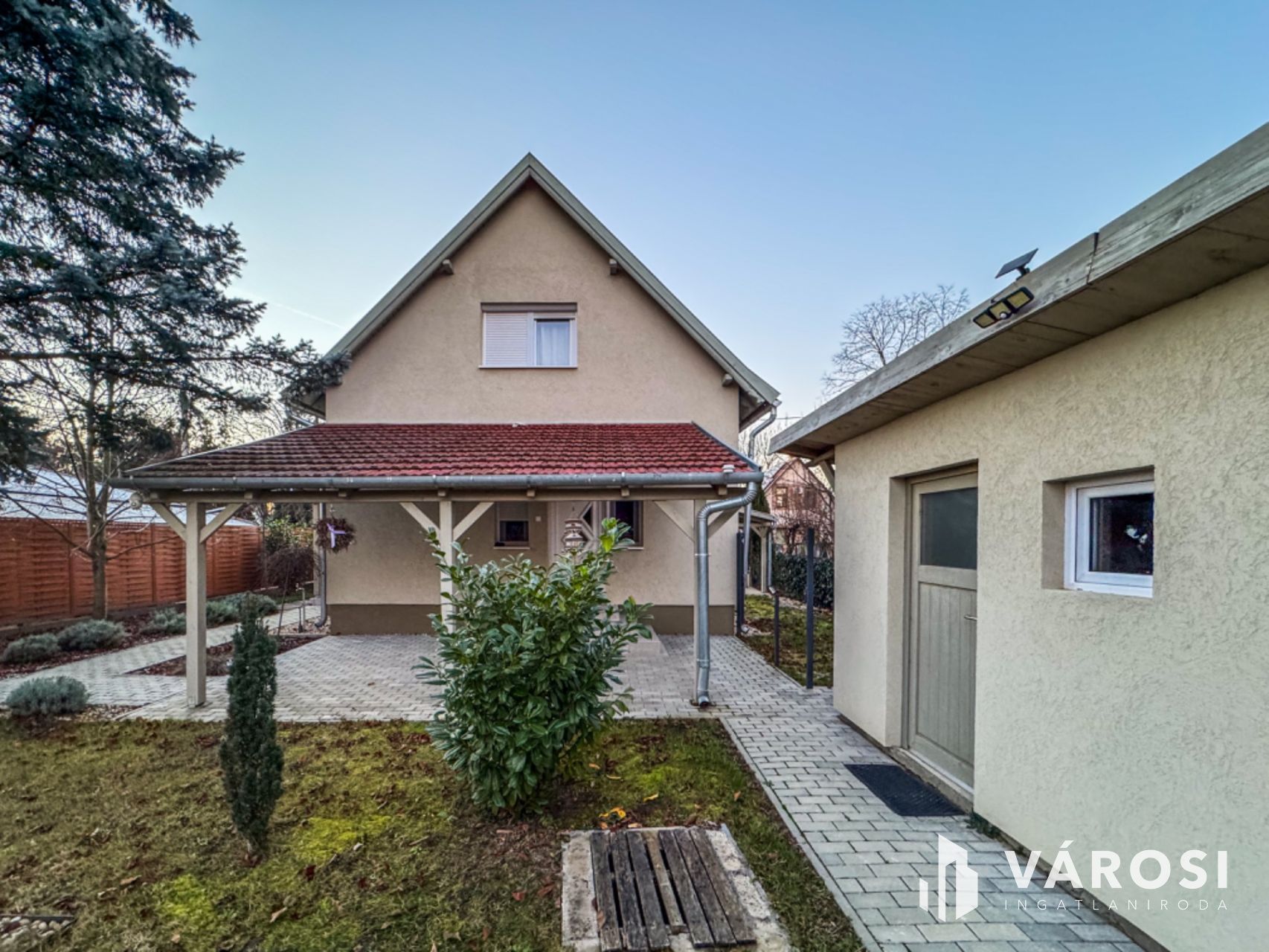 A 450 m²-es telek parkosított udvarral, kertrésszel, terasszal és erkéllyel rendelkezik, ahol a kerti grillezőhely és a fúrt kút is növeli a komfortérzetet. Az udvari gépjárműbeálló lehetőséget ad az autó kényelmes elhelyezésére. A melléképület további tárolási megoldásokat kínál.