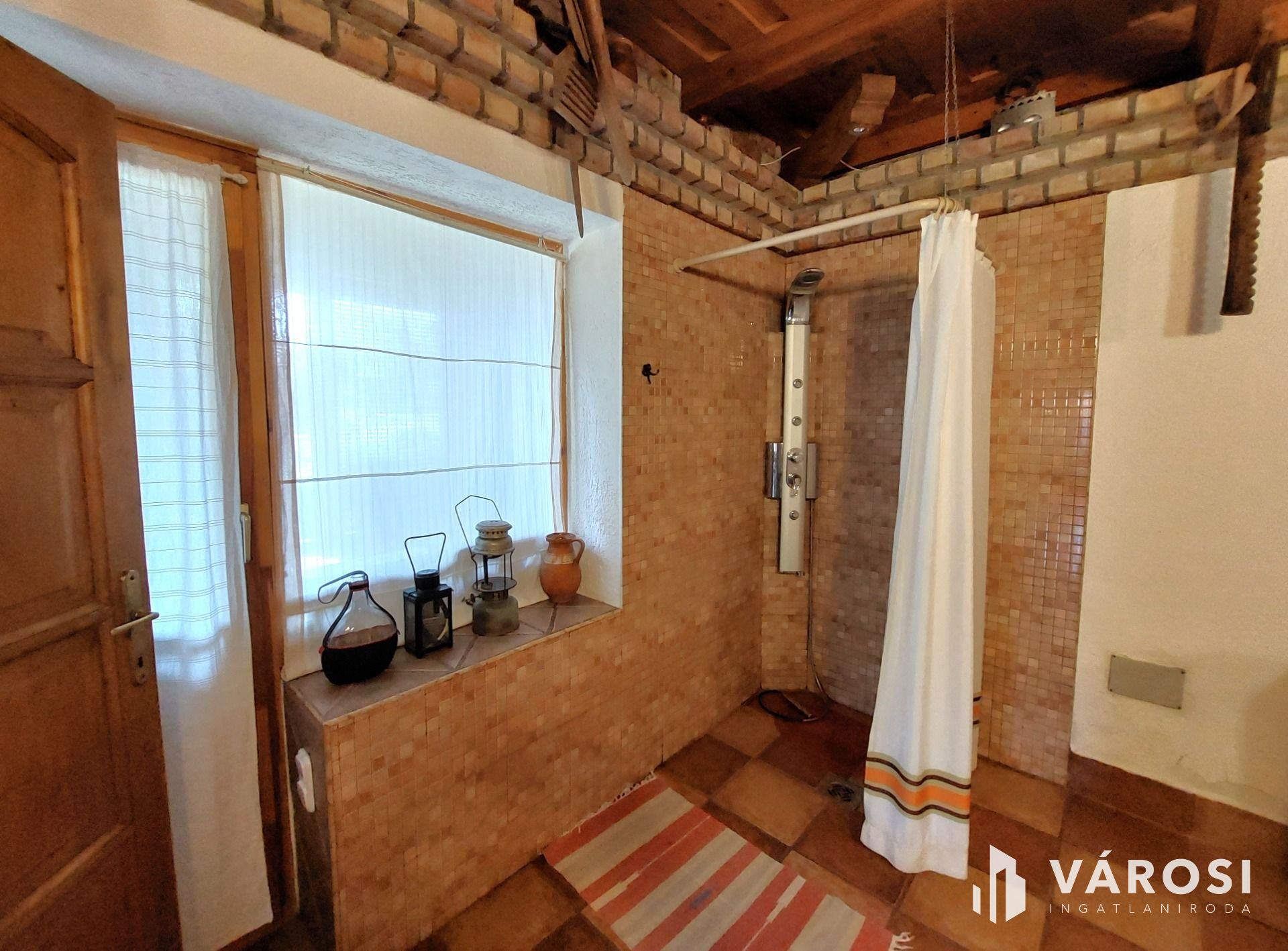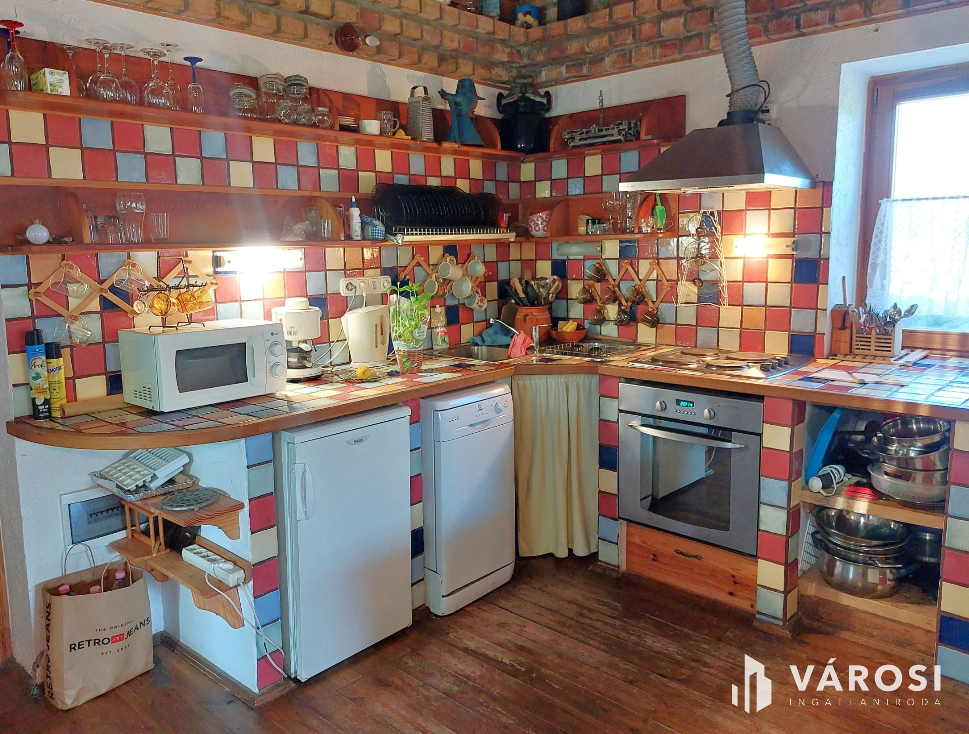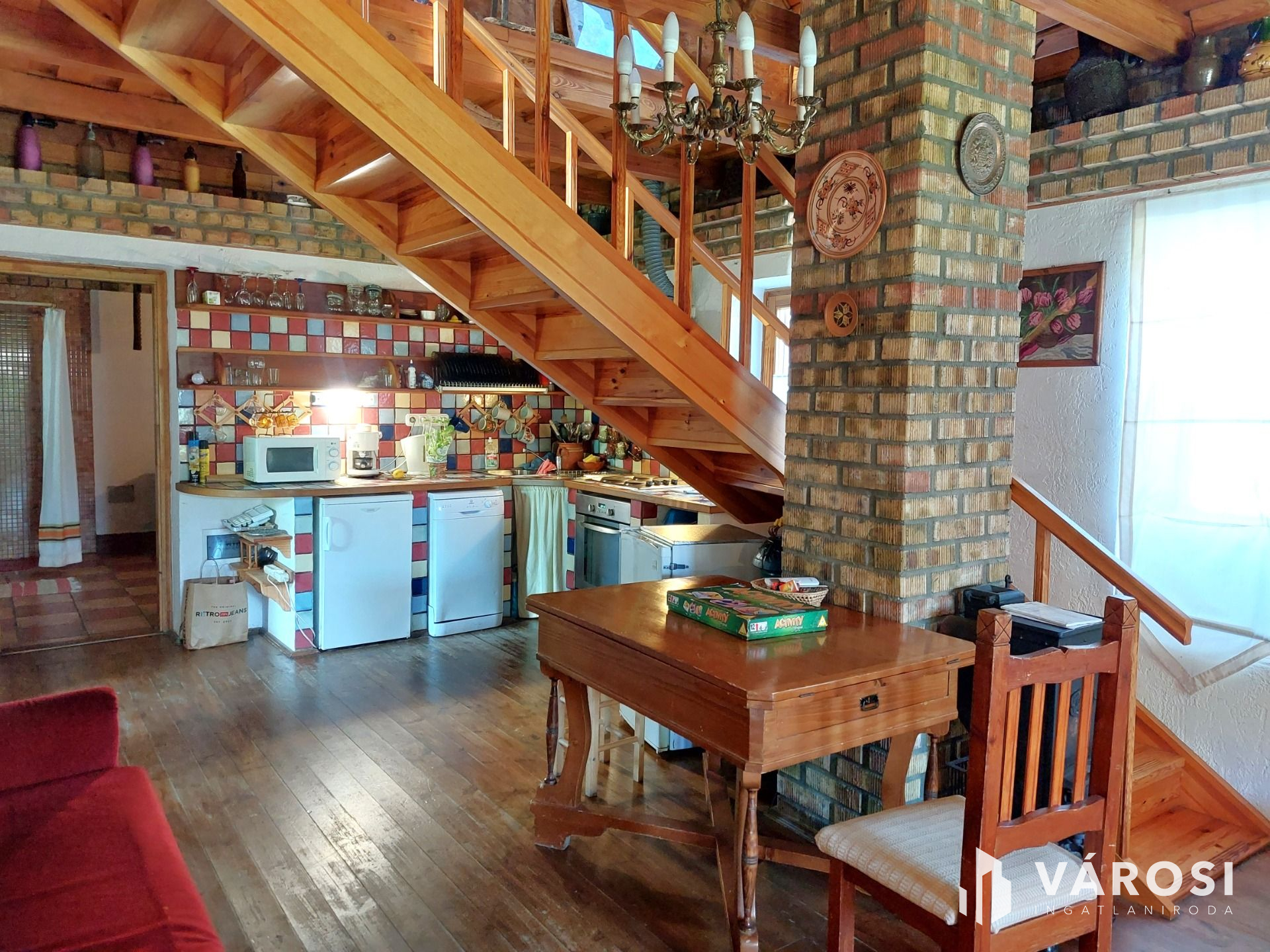 A földszinten 35m2 toszkán stílusban megálmodott nappali-konyha-étkező, tágas fürdőszoba és recepció található. A konyhasarok színes, mázas csempével kirakott, vidám, hangulatos éke az egész lakásnak. Telis-tele a ház éveken át gyűjtögetett régiségekkel, antik tárgyakkal. Ha szeretnék ezt az elbűvölő ingatlant teljes berendezéssel megvásárolni, mángorlóval, szakajtóval együtt, az külön megegyezés tárgyát képezi...