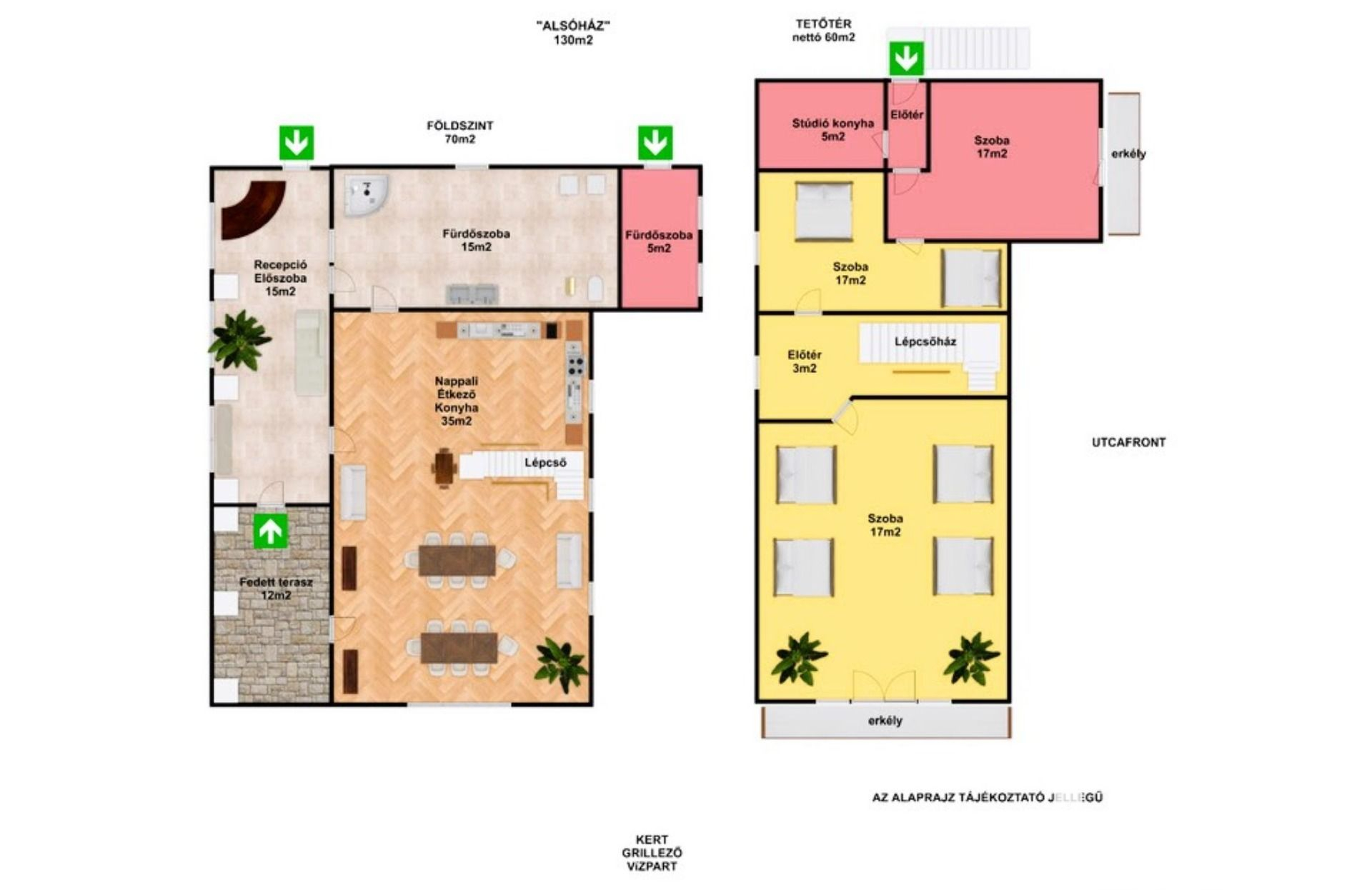 Az "alsóház" kétszintes, tetőtér beépítésű, összesen 130m2 (nettó) lakótérrel rendelkezik.