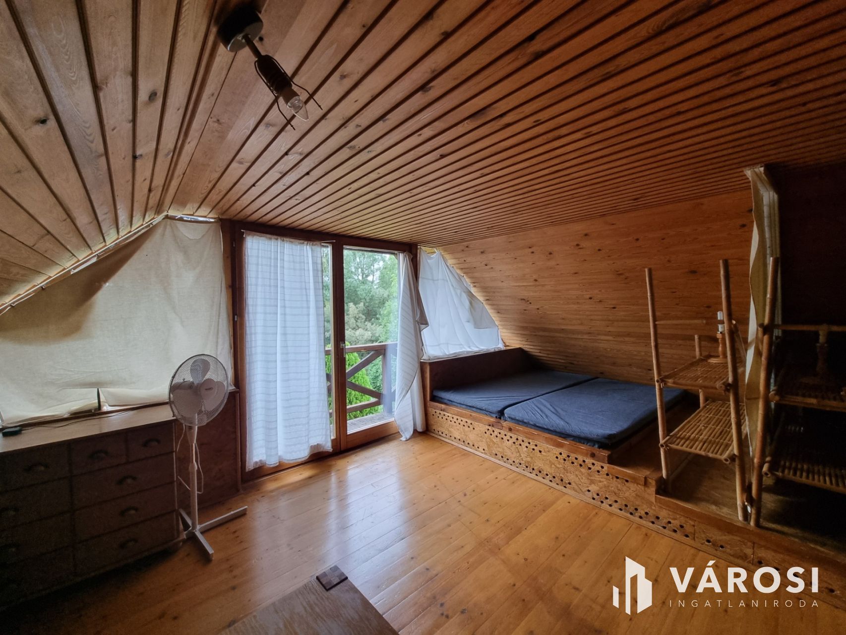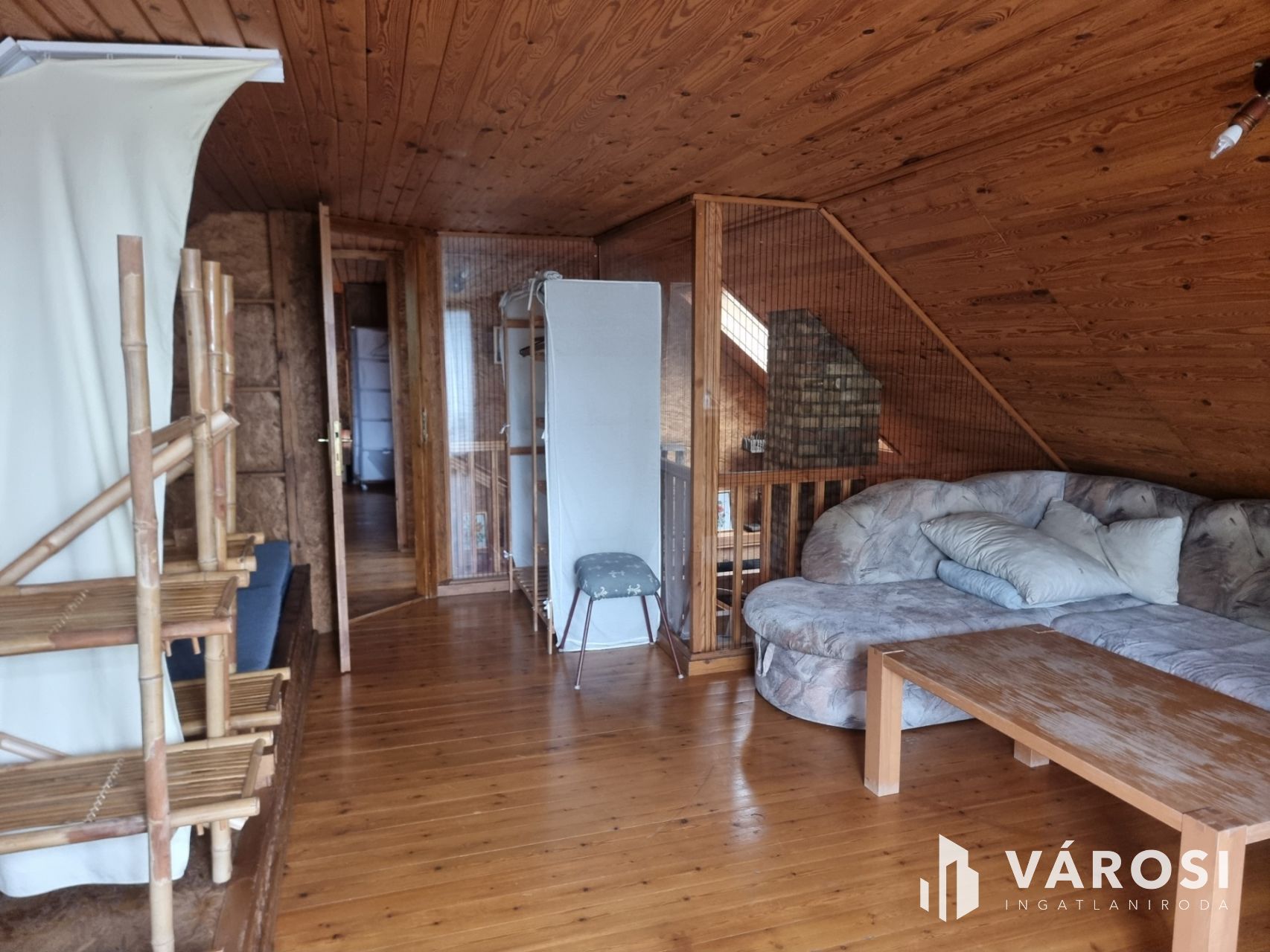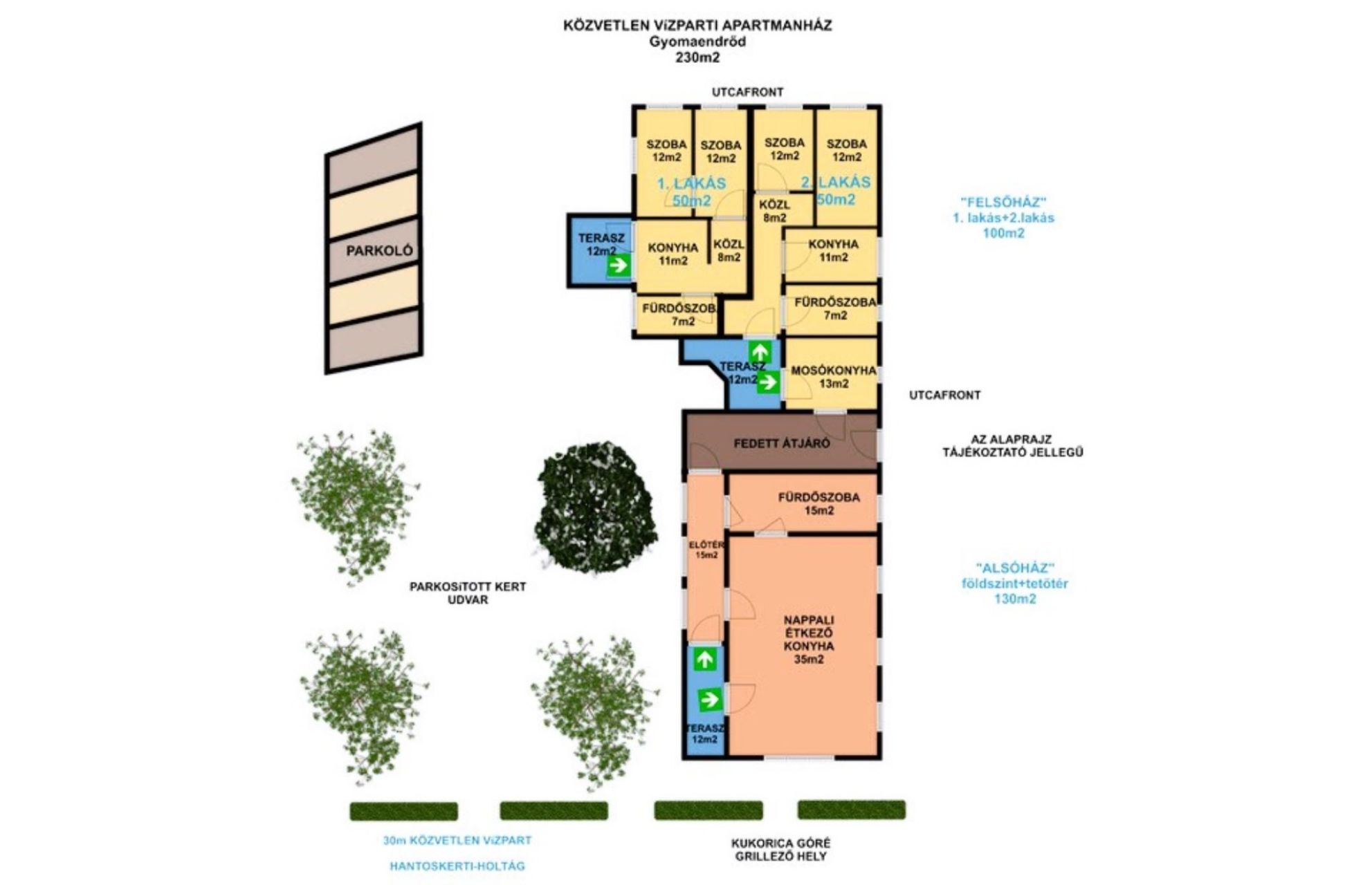 A "felsőház", amely 100m2 alapterületű és jelenleg két apartmanra van osztva. Szoba, konyha, fürdőszoba, mindkettő önálló terasszal. Valamint egy teraszról nyíló, közös háztartási helyiség tartozik mindkét lakáshoz.