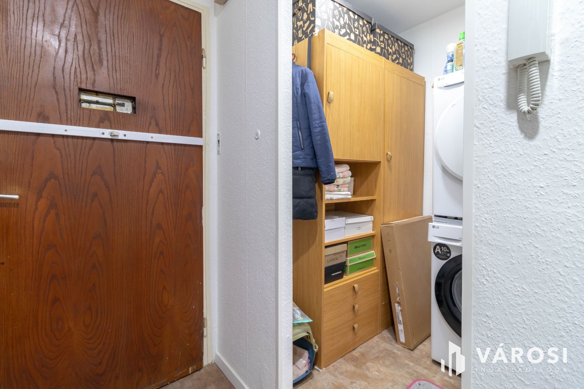 A bejárat melletti gardróbban – ahogy a fotókon látható – mosógéphez, szárítógéphez kialakított vizes csatlakozás érhető el.