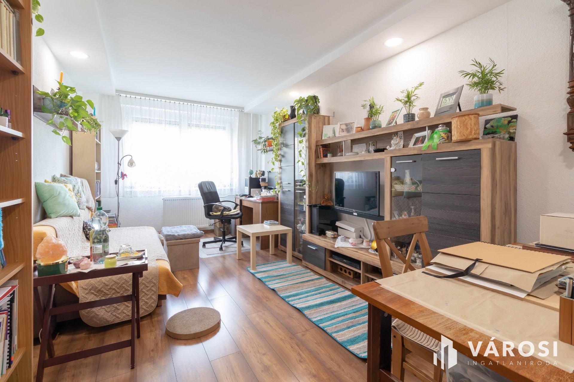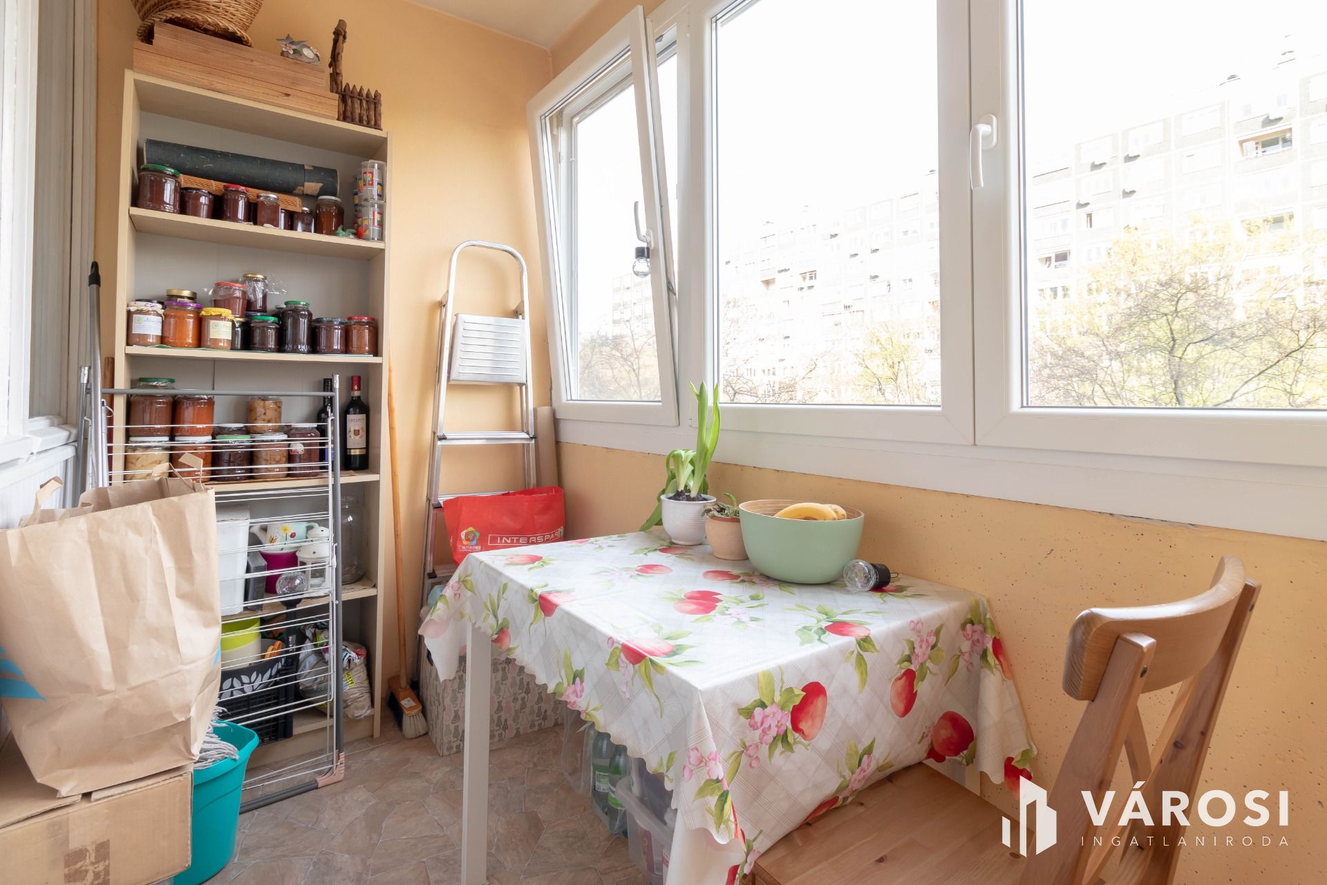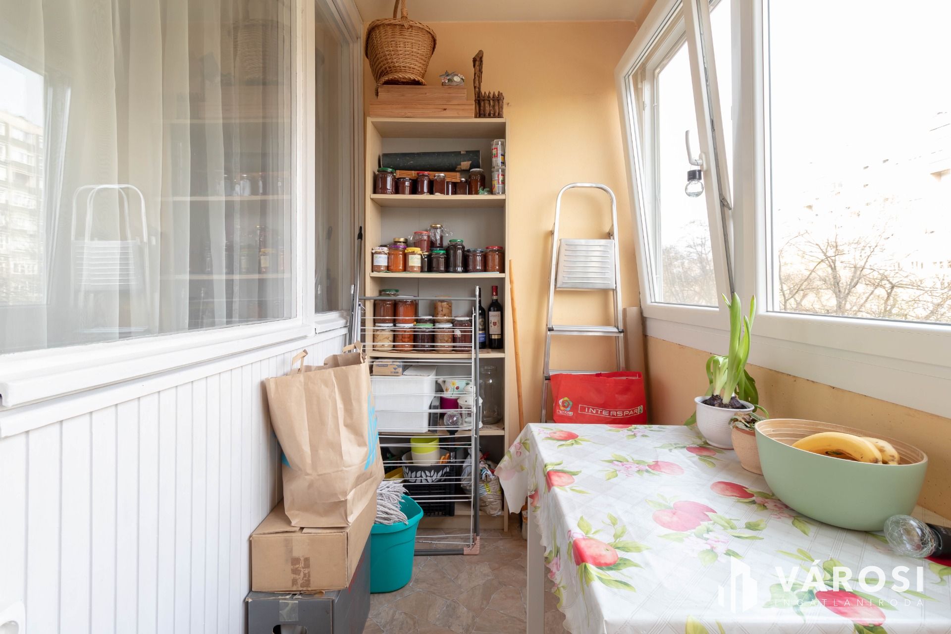 A nappali ablakai redőnyözöttek, a lakás minden ablaka szúnyoghálóval szerelt.