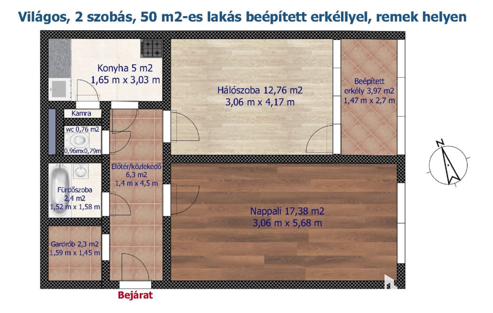 In this 50 sqm, 2nd-floor, east-facing, bright apartment – with the layout and dimensions shown on the floor plan – every room opens from the spacious entrance hall. The bedroom is connected to an enclosed balcony running the full width of the room, which significantly increases the usable space of the apartment.