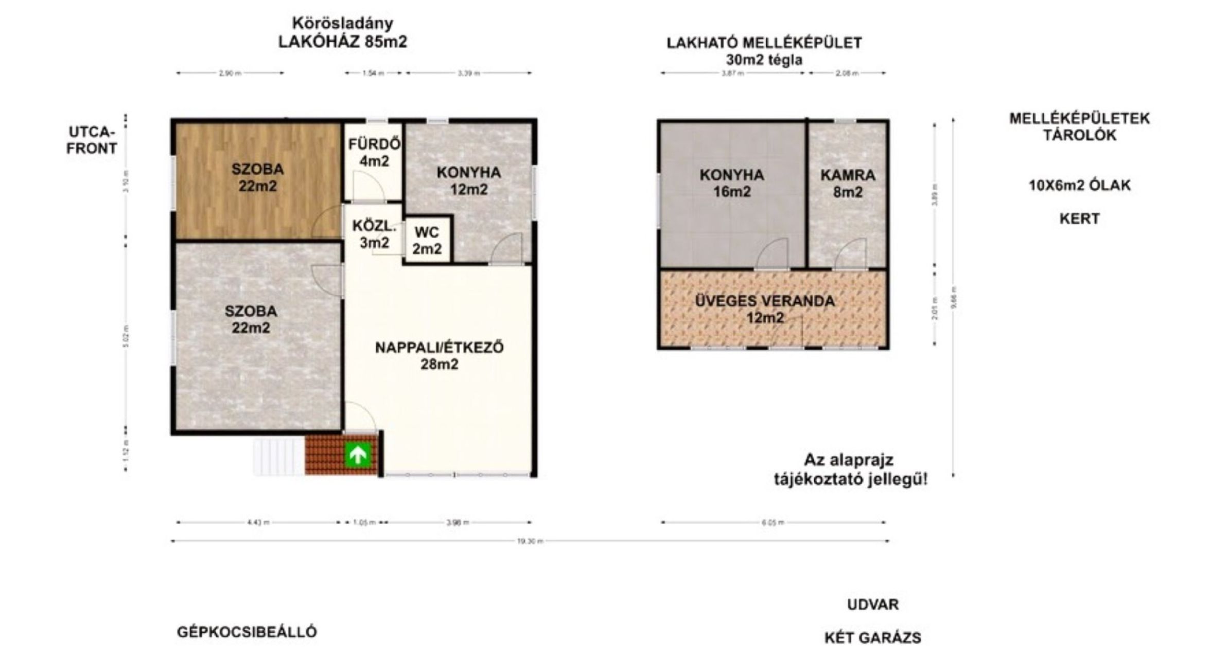 + 85m2 lakóház, 30m2 lakható melléképület, 25 m2 garázs, 2x15m2 garázs/ tároló, 60m2 (10x6m2 praktikus kialakítású) ólak.