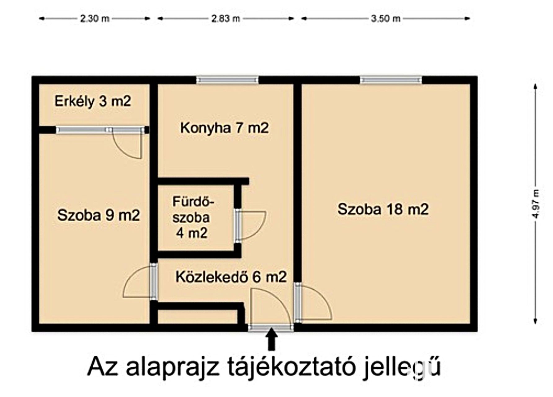 A 47 m2-es lakás részei: egy egész és egy fél szoba erkéllyel, fürdőszoba-WC, közlekedő, konyha.