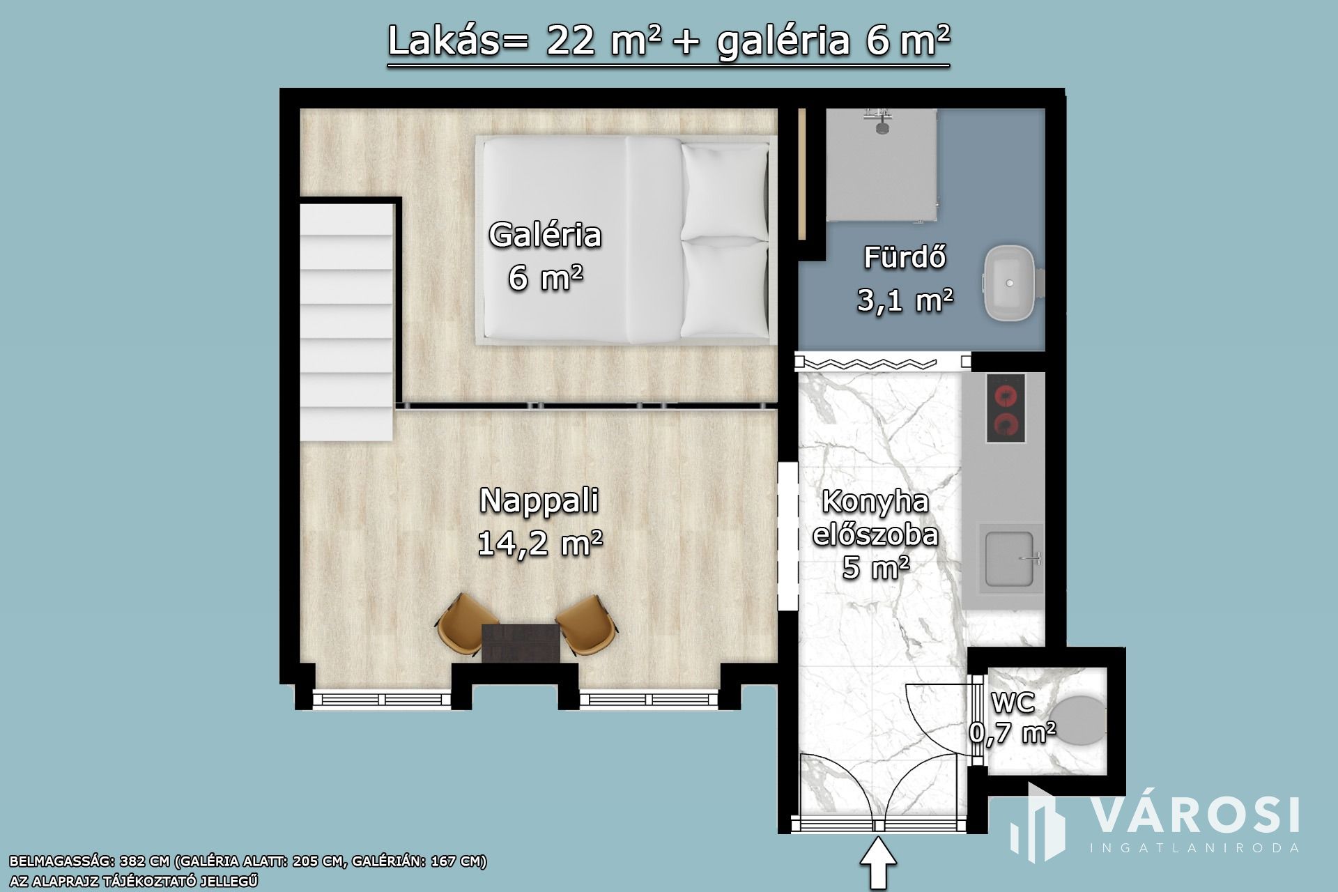 - Alapterület: 22 m² + 6 m² galéria