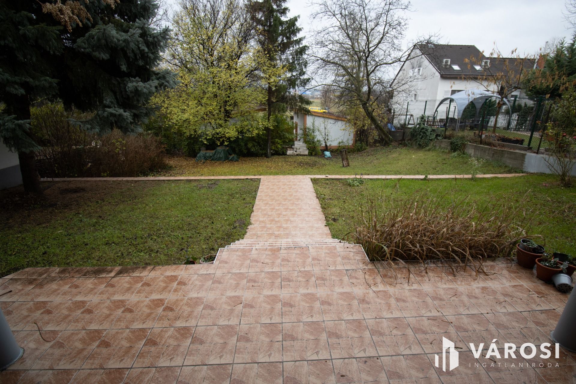Az ingatlan elhelyezkedésének köszönhetöen, néhány lépcsőt lefelé kell menni a lakás megközelítéséhez, mivel az az alsó szint, de cserébe az egész kert, terasszal a lakáshoz tartozik kizárólagosan.