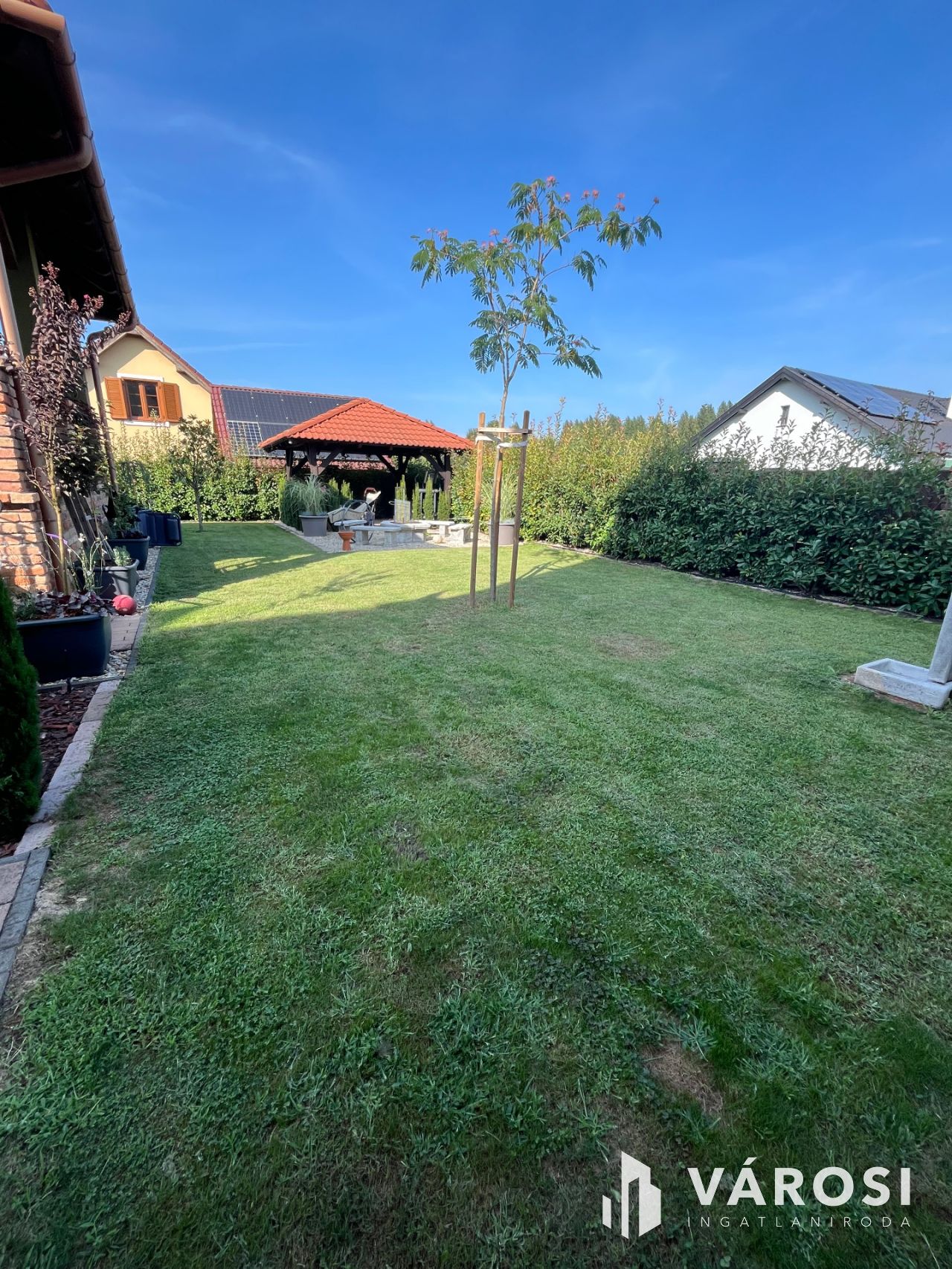 A 800 m²-es telek igazi ékkő. Az előkert rendezett, térkövezett, örökzöldekkel díszített, automata öntözőrendszerrel ápolt. A hátsó kert viszont egy valódi privát oázis: zöld gyep, külön grillező- és sütögetőhely, hangulatos szaletli — tökéletes helyszín baráti estékhez, családi ünnepekhez vagy egy csendes borozáshoz egy hosszú nap végén. A nappaliból közvetlen teraszkapcsolat nyílik erre a kertre, így a belső és külső tér szinte egybeolvad.