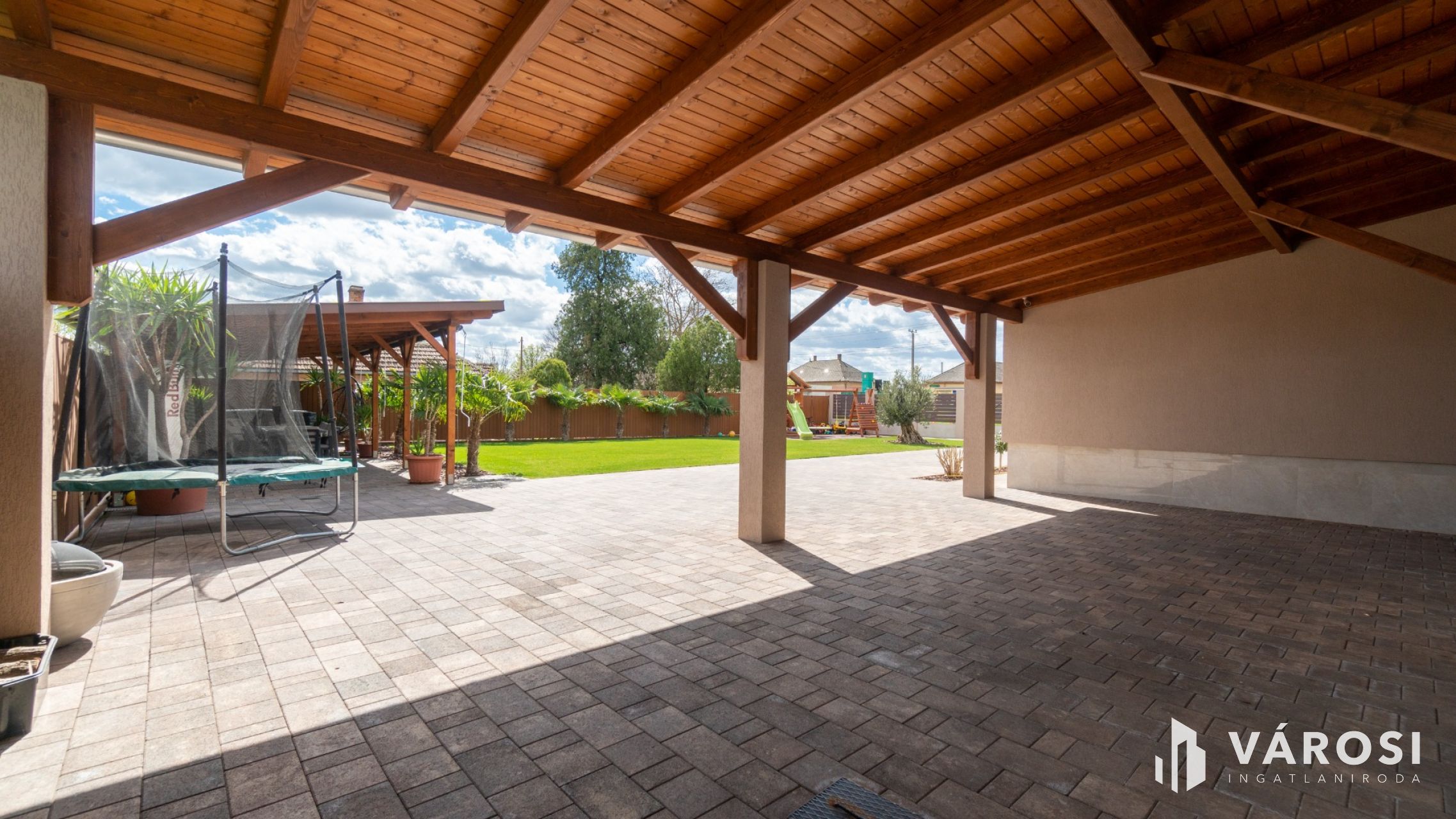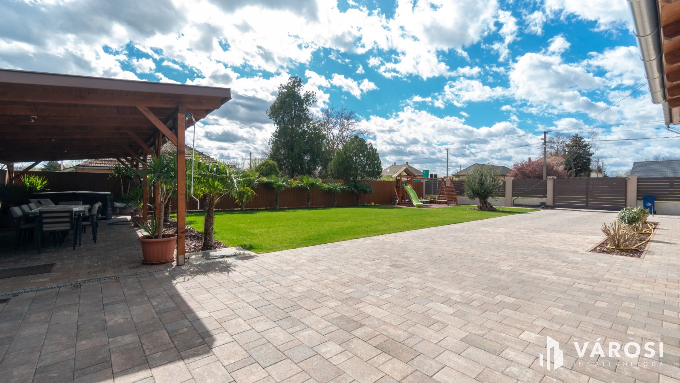 A gyönyörűen parkosított kert pálmafákkal és olajfával van teleültetve, automata öntözőrendszer van kiépítve, valamint fúrt kút is rendelkezésre áll. Az udvarban egy 40 m²-es fedett terasz is helyet kapott, így a szabadidő kellemesen tölthető a friss levegőn. Az autók elhelyezésére egy elektromos garázsajtókkal felszerelt 68 m² dupla garázs, valamint az előtte elhelyezkedő 80 m²-es fedett gépkocsibeálló áll rendelkezésre. A biztonságról a kiépített kamera- és riasztórendszer gondoskodik.