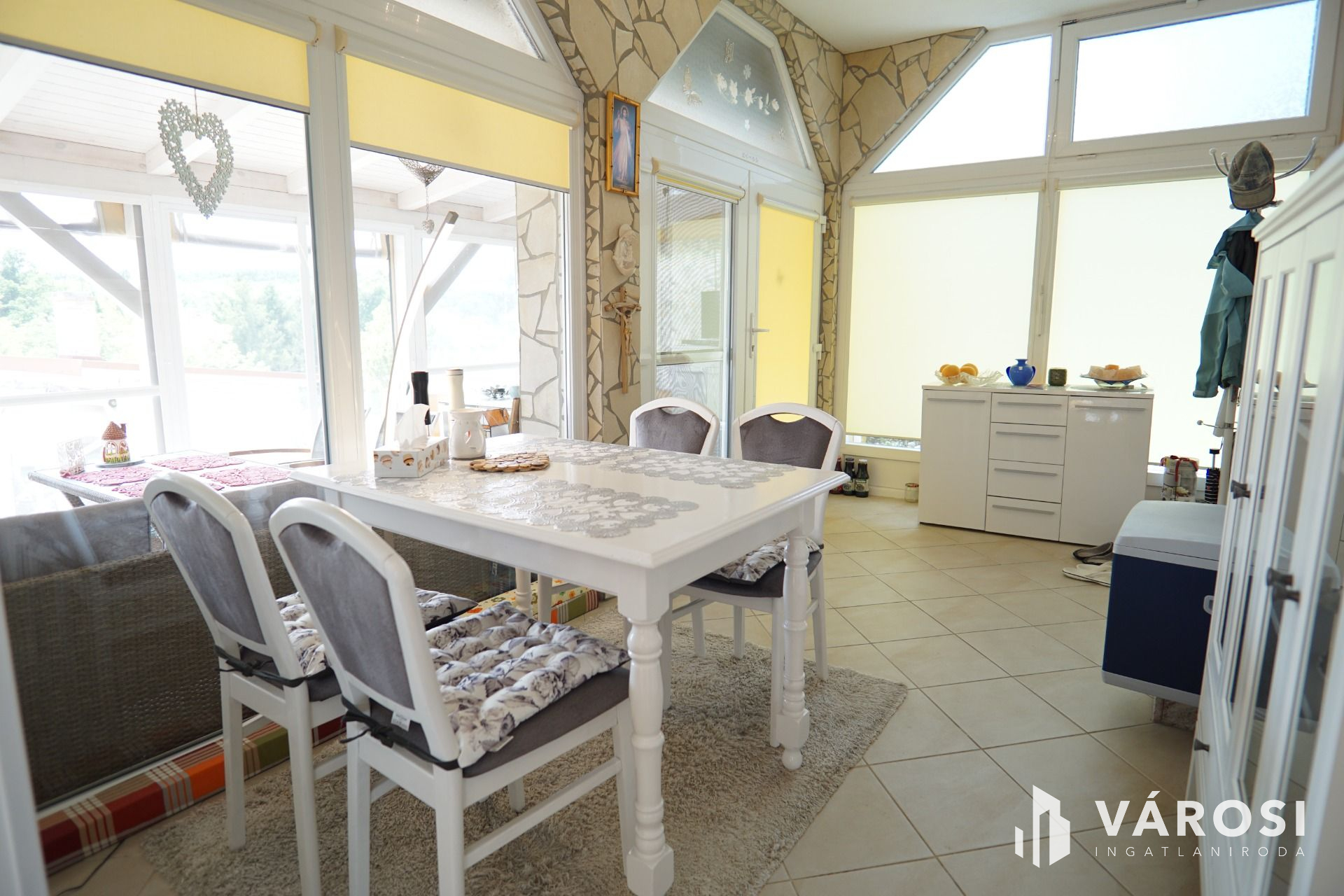 A mediterrán térkővel ellátott udvarról egy lépcsőn keresztül lépünk be egy nagy négyzetméterű teraszra. (ponyvával, szúnyoghálóval felszerelve) Ezen helységből tovább haladva található egy közlekedő és egy étkező , ahonnan közvetlen konyha és teraszkapcsolattal találkozunk. Az épület hátsó szegmensébe található egy dolgozósarok, valamint a fürdő mellékhelységgel együtt. A tetőér beépítésre került ahol található egy nagy hálószoba sok pakolási lehetőséggel.