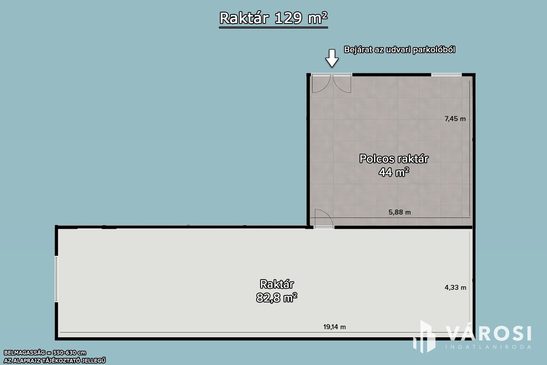 A raktárterület 550-630 cm belmagasságú.