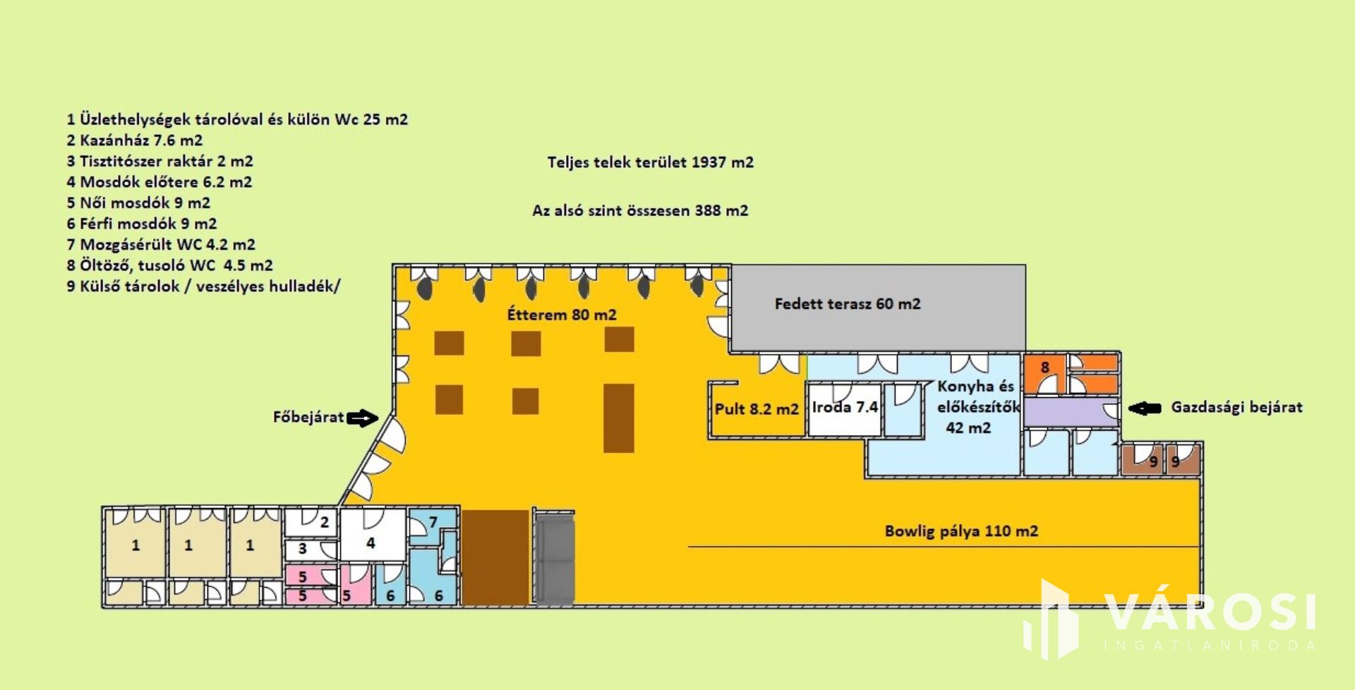 - Az ingatlan tehermentes, tulajdoni lapon "kivett üzlet, udvar, konferenciaterem, panzió, étterem" besorolással.