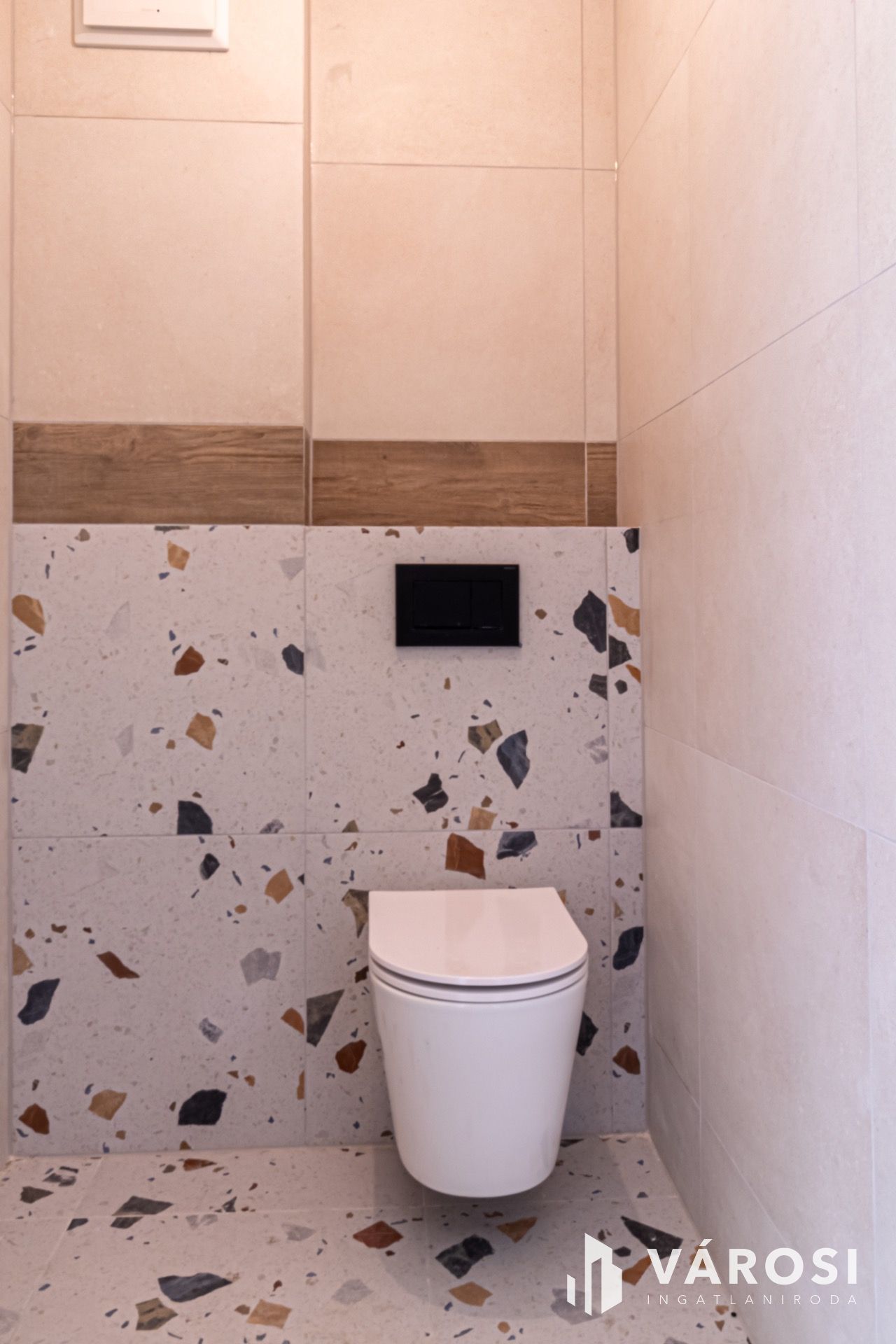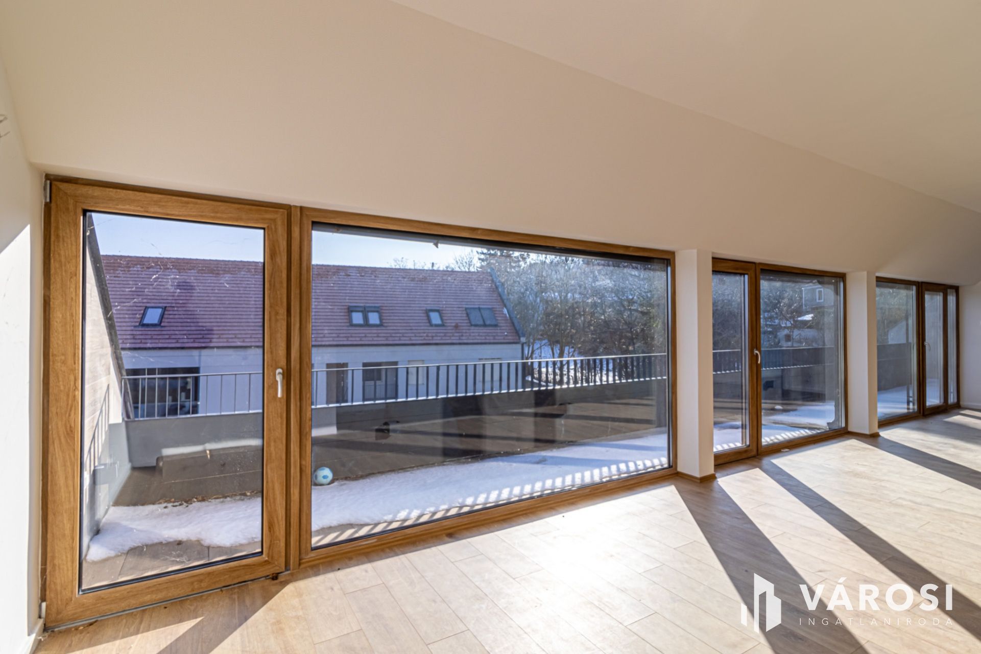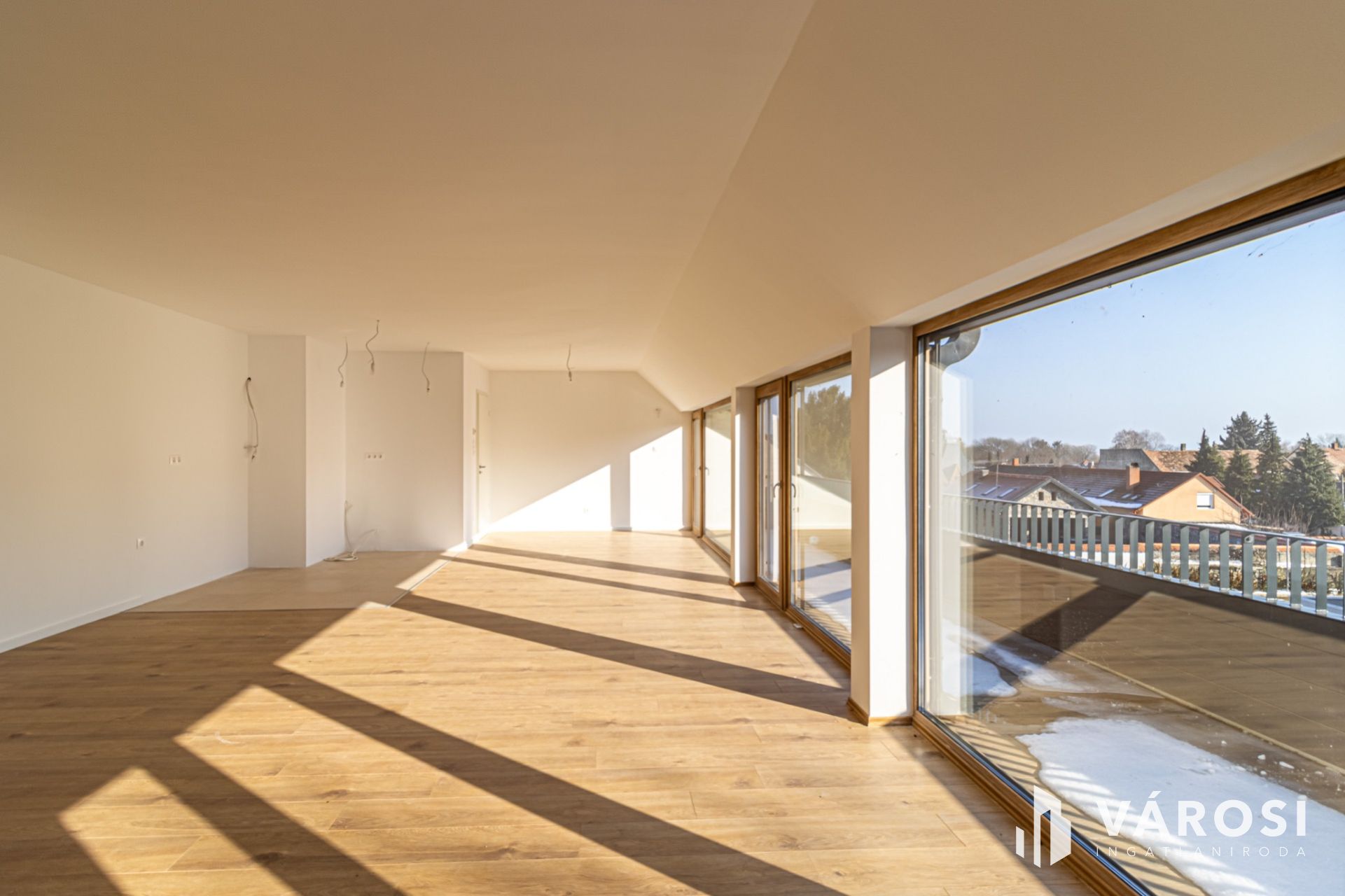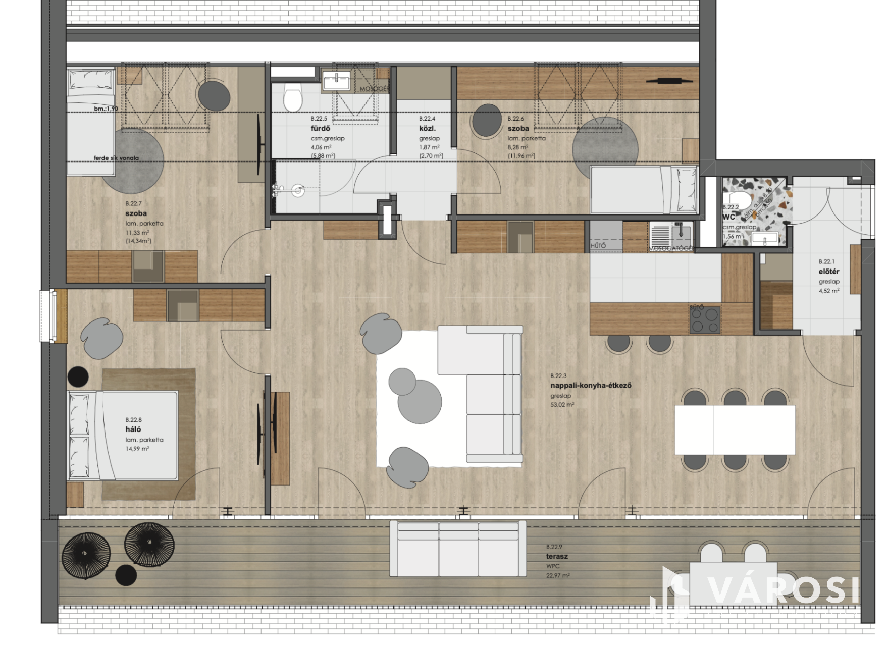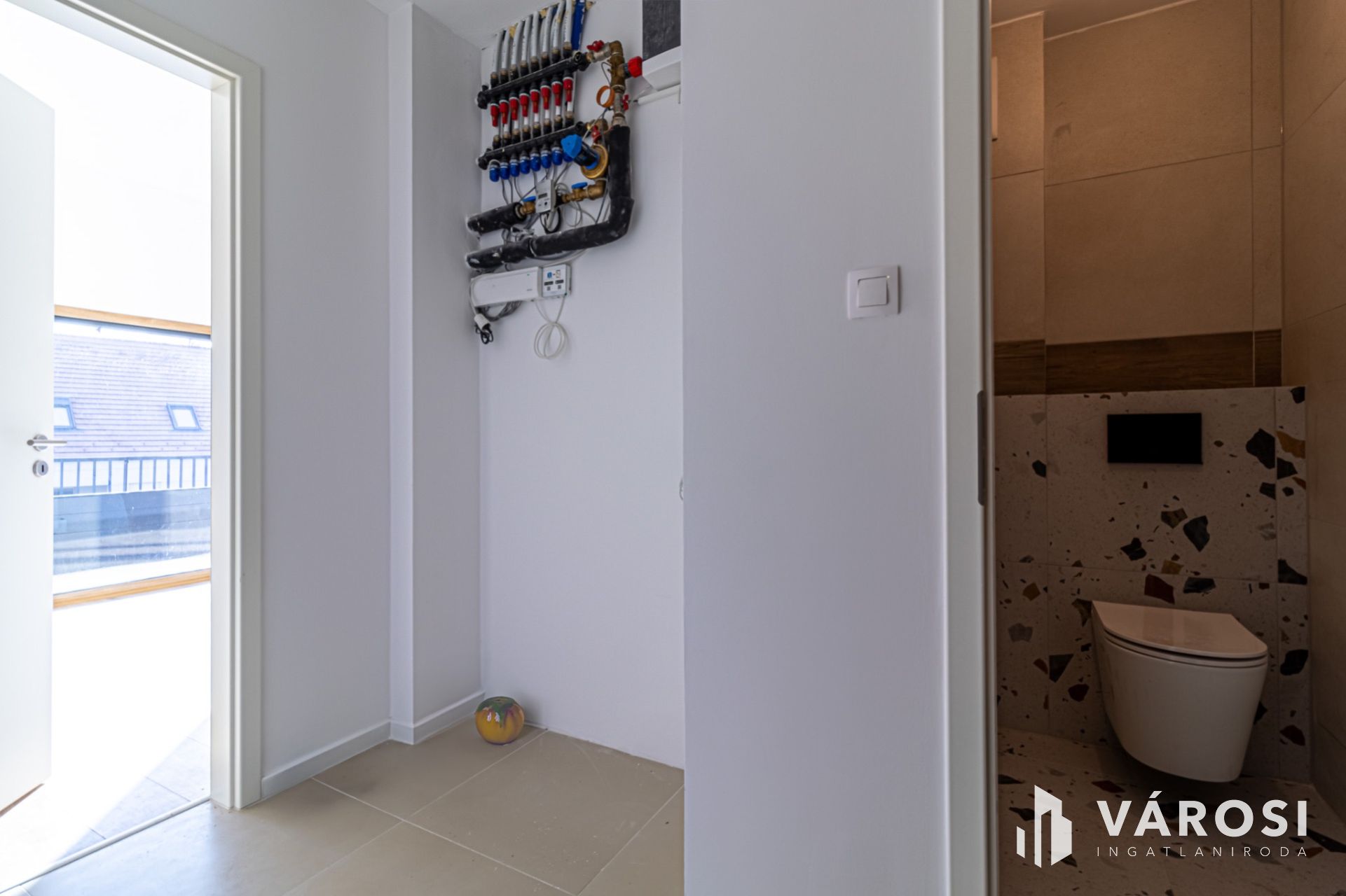 A 105,6 m²-es lakótérhez egy impozáns, közel 23 m²-es terasz kapcsolódik, amely az amerikai konyhás nappali és az egyik hálószoba előtt teljes szélességében végigfut. Délkeleti tájolásának köszönhetően egész nap világos, tágas terei és három külön nyíló hálószobája valódi életteret biztosítanak akár nagyobb család számára is.