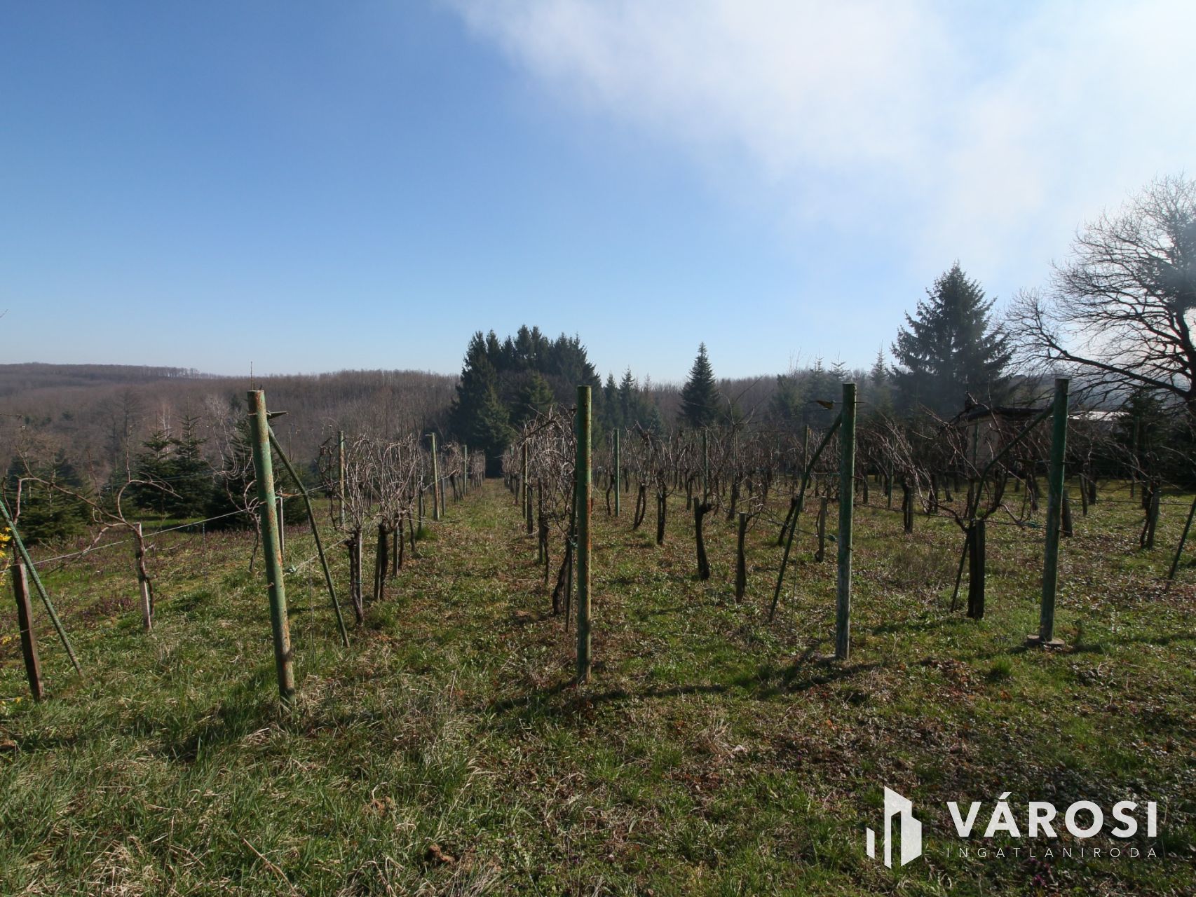 A felső részen 10 sor borszőlő tőke élvezi a napfényt körbevéve termő gyümölcsfákkal.