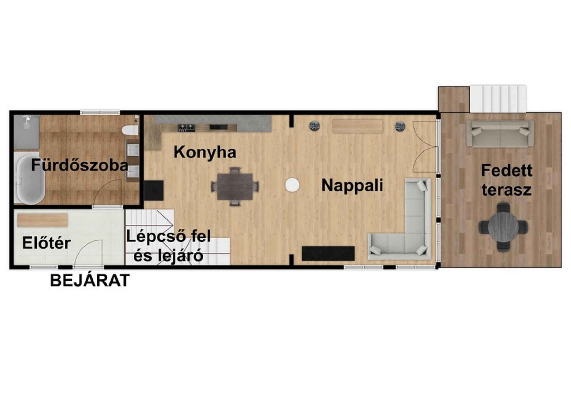 -Földszinten az amerikai konyhás nappalit, fürdőszobát, előszobát és a tágas teraszt