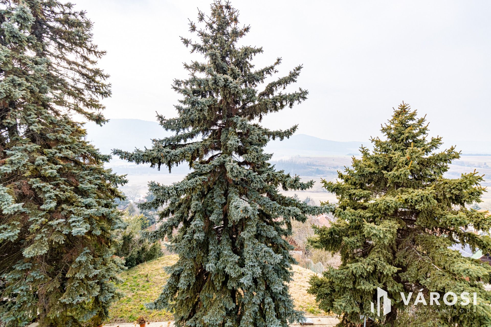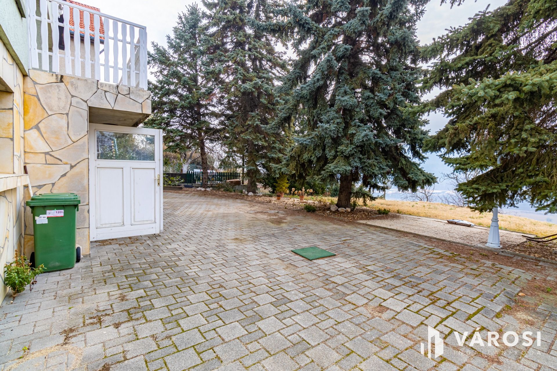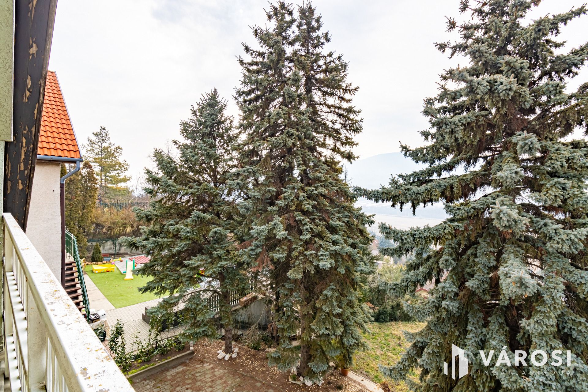 Hatalmas terasz, remek kilátás a környező dombokra, néhány hatalmas ősfenyő is található a ház előtti kertben.