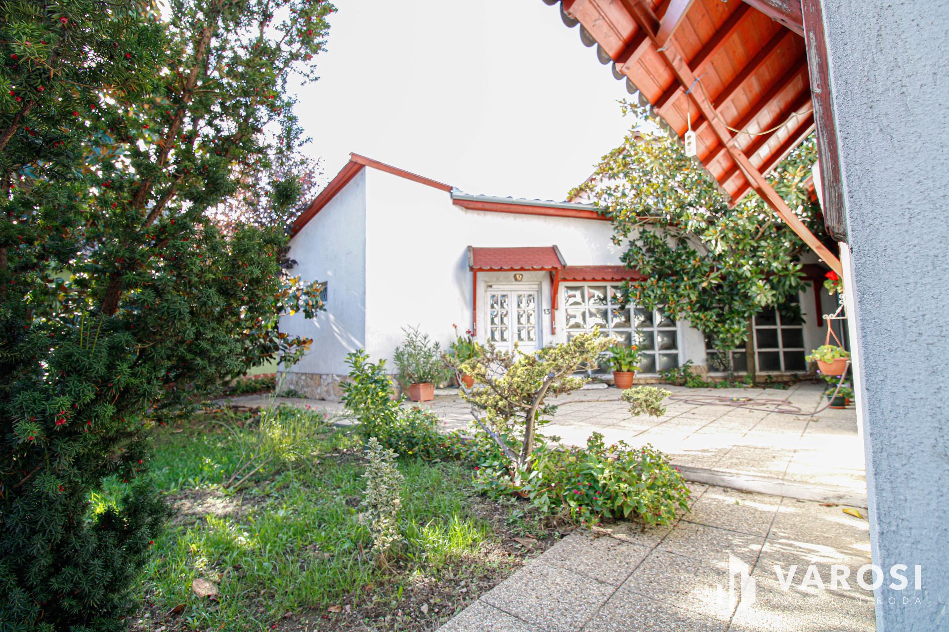 Az udvar rendezett, az előkert dísznövényekkel van telepítve. Fedett garázs és egy tárolóhelyiség található még a területen.