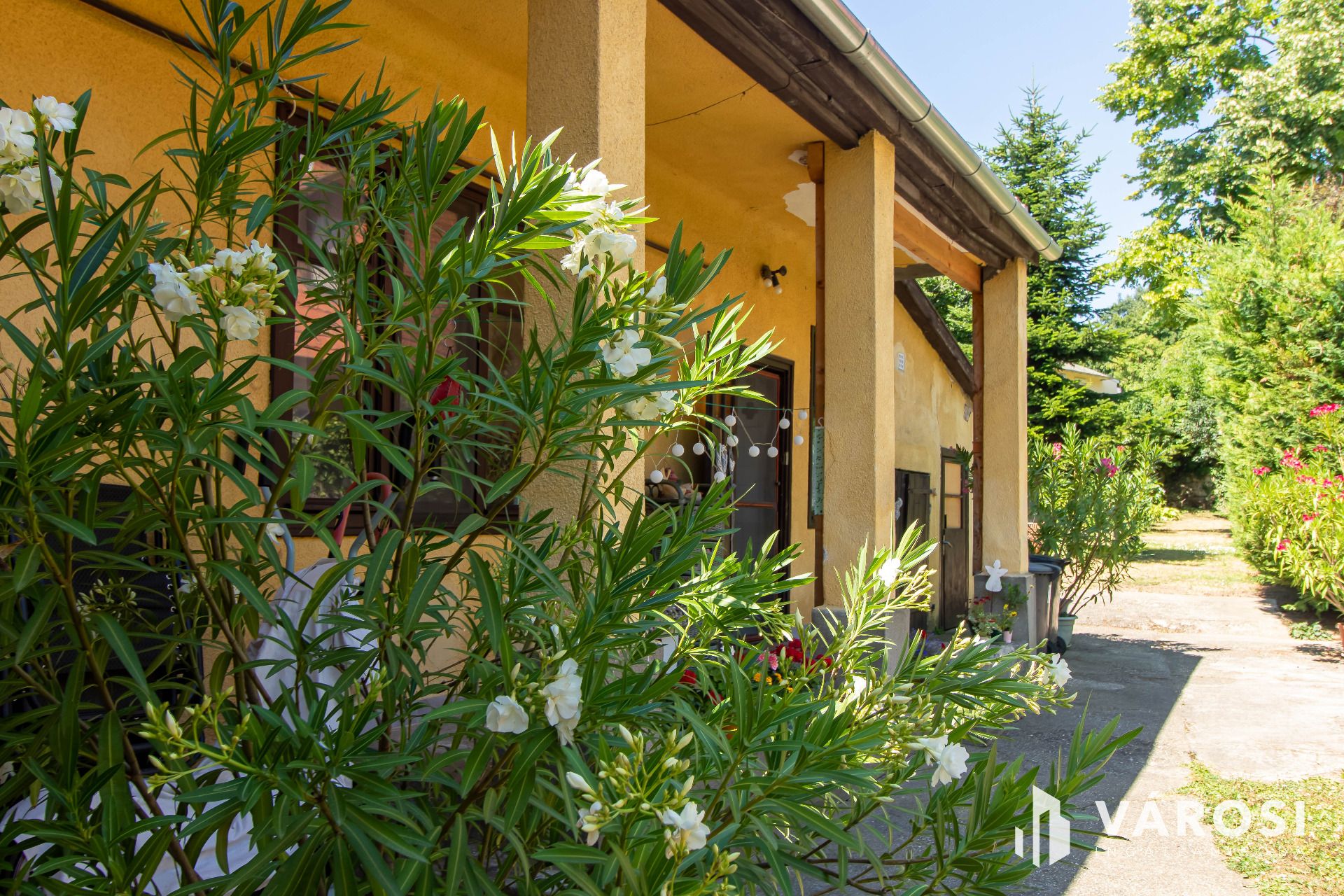 A házhoz tartozik egy pince, tárolóhelyiségek, valamint egy kis fedett terasz is. A kert rendezett, tele virágokkal, kerti kiülővel, a telekhatárt pedig egy körülbelül másfél méter magas, régi kövekből rakott kőfal szegélyezi, amely sajátos hangulatot kölcsönöz az udvarnak. Minden közmű be van vezetve, az ingatlan infrastruktúrája teljes. A környéken karnyújtásnyira megtalálható minden fontos szolgáltatás: bolt, iskola, óvoda, orvosi rendelő, tömegközlekedés – tényleg csak pár lépésre van minden.