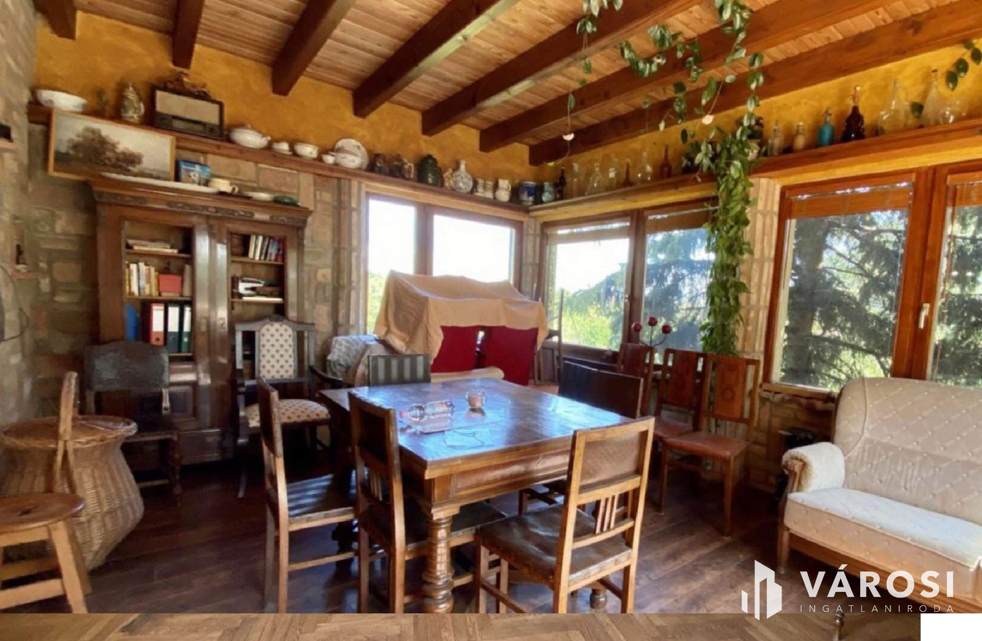 Az igazán egyedi hangulatú kialakítással rendelkező családi otthon, átlagos állapotú, kényelmes terek és kellemes, nyugodt környezet jellemzi. A nagy méretű telken egy gépkocsi tárolására alkalmas zárt garázs , illetve két gépkocsi beállására alkalmas fedett garázs, továbbá egy pince, ásott kút, és egy melléképület helyezkedik.