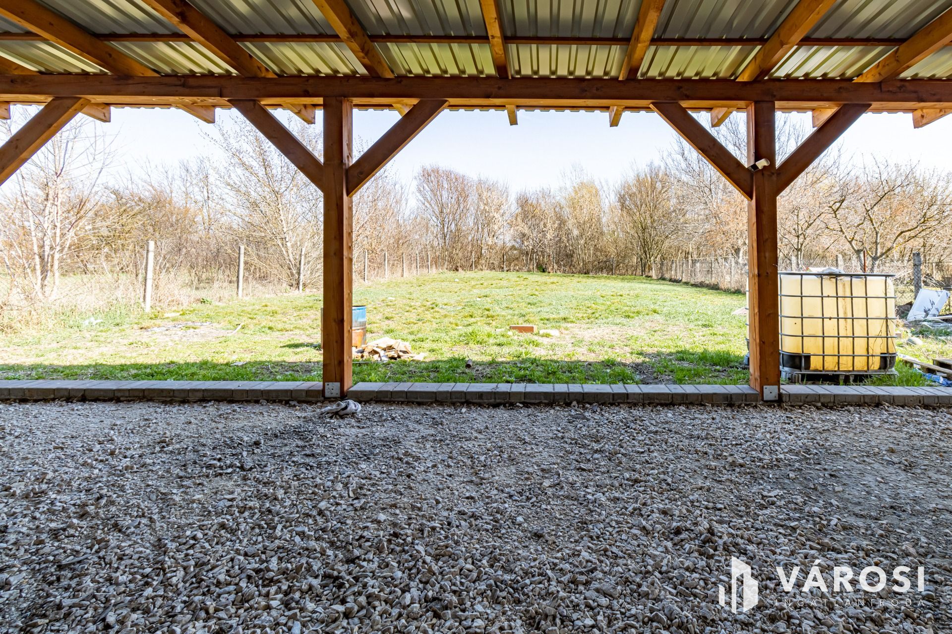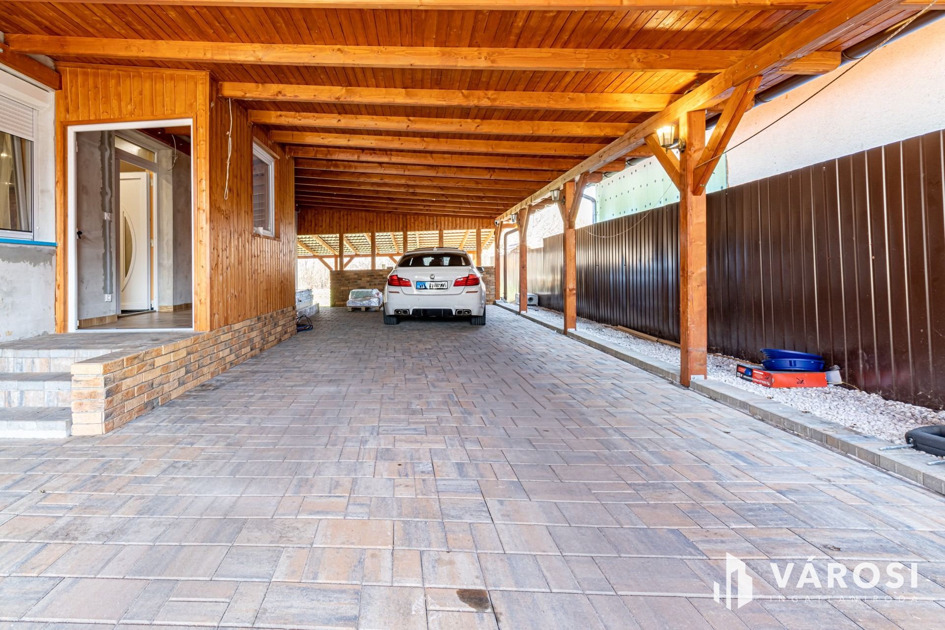 Körbekerített 977 m2-es telekkel, a ház előtt 95 m2-es, térkövezett, fedett autóbeállóval és az épület mögött, hasonló méretű, további fedett terasz előkészítéssel.
