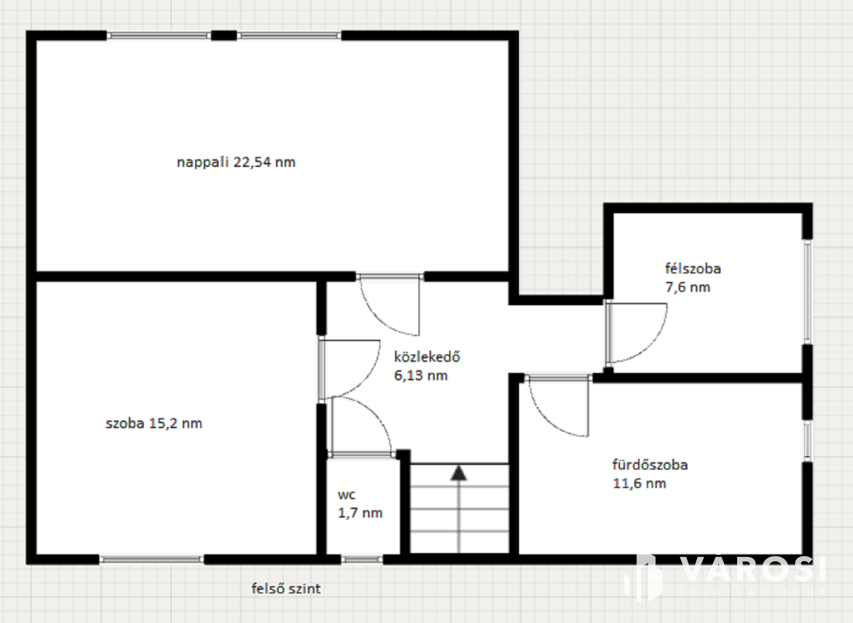 Felső szinten: 1 plusz fél szoba, közlekedő, fürdőszoba, wc, nappali.