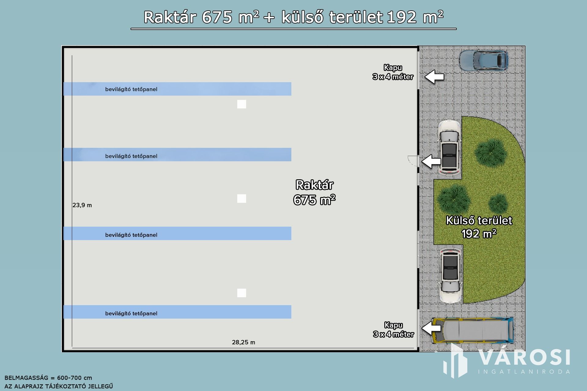A raktárhoz tartozik az épület előtt található 192 m2 terület használati joga, illetve minden csarnokhoz jár parkolóhely is.